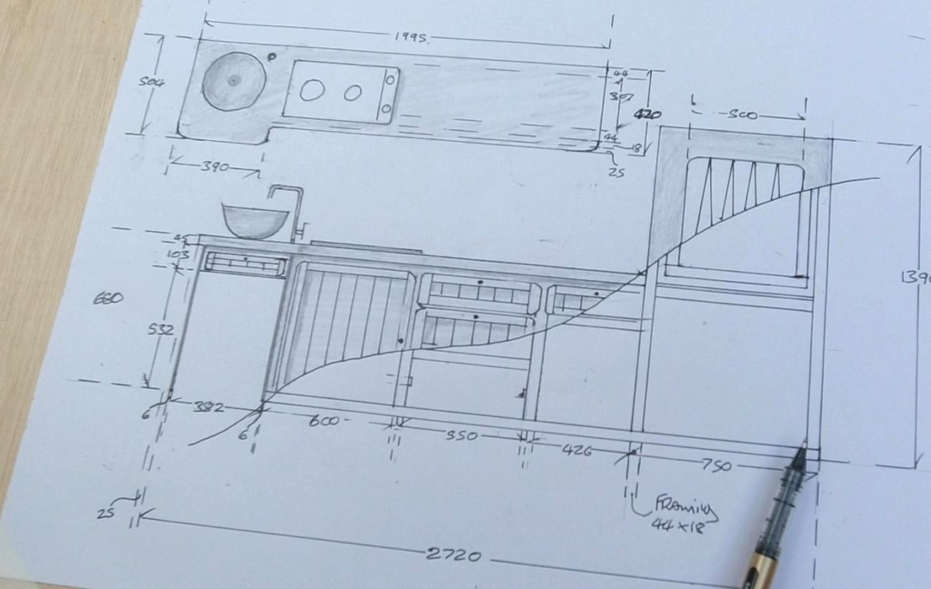 Once you have a layout that you are happy with it is well worth making a more detailed drawing and even getting the correct dimensions of the sink, hob etc so that you are sure everything will fit before you buy them and start your build.